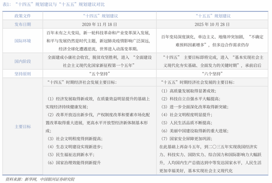 主题投资机会展望:(1)新质生产力领域:推动高质量发展,最重要是加快高水平科技自立自强,积极发展新质生产力。在外部不确定性加大的环境下,中国对科技自立自强的要求逐步迫切。顺应国家战略、具备真实技术壁垒的科技企业将是“十五五”规划背景下A股投资的重要主线。(2)反内卷领域:要综合整治“内卷式”竞争。统一市场监管执法,加强质量监管,完善行政裁量权基准制度,强化反垄断和反不正当竞争执法司法,形成优质优价、良性竞争的市场秩序。反内卷成为宏观调控的重要抓手,相关板块中长期投资价值提升。(3)消费领域:消费作为内需的重要部分,对稳定经济基本盘至关重要。惠民生和促消费、投资于物和投资于人相结合驱动的服务消费赛道,顺应新趋势的新型消费等细分领域值得重点关注。(4)“两重”领域:《建议》稿强调高质量推进国家重大战略实施和重点领域安全能力项目建设,“两重”项目的建设将推动产业链的完善和发展,相关企业受益于订单增长与业绩释放。(5)金融板块:《建议》稿中17次提到“金融”一词,明确提出“加快建设金融强国”要求。要实现资源的合理配置,强化服务实体经济发展的功能,就离不开资本市场的作用发挥。金融机构作为桥梁与保障的作用将愈发凸显。