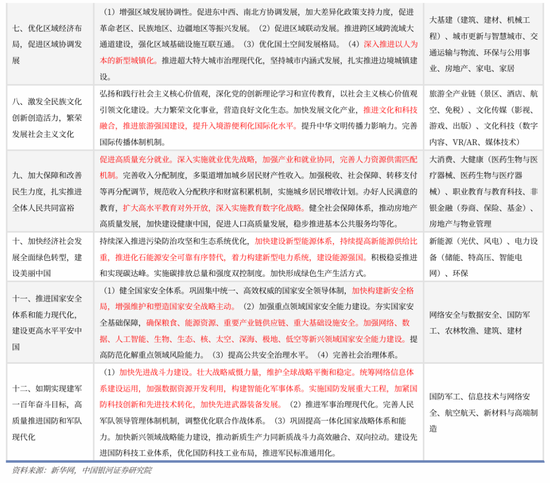 (12)如期实现建军一百年奋斗目标,高质量推进国防和军队现代化。利好国防军工、 信息技术与网络安全、航空航天 、新材料与高端制造等板块。