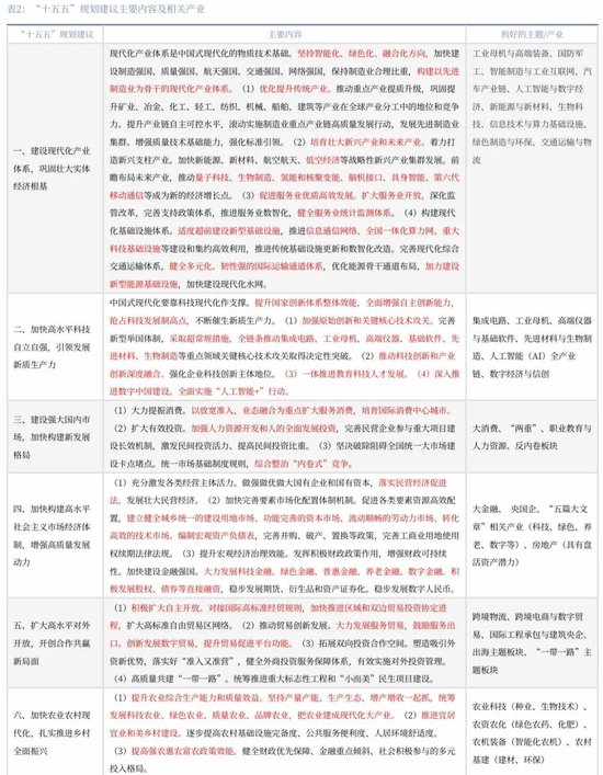 重点关注《建议》稿提到的新能源、新材料、航空航天、低空经济等战略性新兴产业,量子科技、生物制造、氢能和核聚变能、脑机接口、具身智能、第六代移动通信等未来产业,集成电路、工业母机、高端仪器、基础软件、先进材料、生物制造等重点领域,以及重点提及的人工智能、创新药、海洋经济、国防军工等板块。