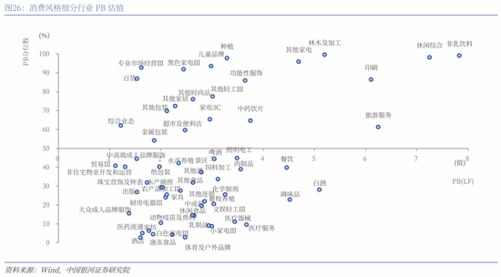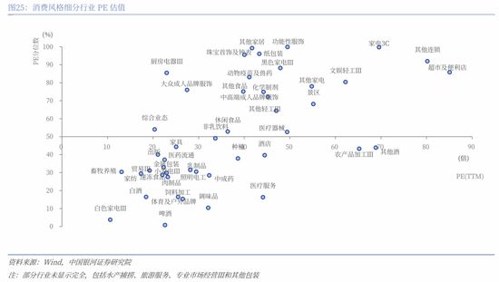 从PE估值来看,截至10月13日,25个细分行业估值处于2010年以来50%分位数水平以下,其中,啤酒、白色家电行业估值位于2010年以来10%分位数水平下方,调味品、体育及户外品牌、医疗服务、白酒、饲料加工等行业估值也处于历史较低水平。从PB估值来看,39个细分行业估值处于2010年以来50%分位数水平以下,占全部细分行业总数近三分之二。其中,酒店、体育及户外品牌、白色家电、速冻食品、医药流通、家纺、小家电、乳制品、医疗服务行业估值均位于2010年以来10%分位数水平下方。