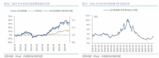 反内卷指数(8841916.WI)主要跟踪响应政策倡导降低内耗、遏制无序价格竞争相关领域代表性公司的整体表现,主要包括:光伏设备、电池、医疗服务等。2025年7月1日-10月27日期间,反内卷指数上涨42.02%,同期沪深300指数上涨19.82%。截至10月27日,反内卷指数的PB估值为2.759倍,处于2016年以来24.64%分位数水平。