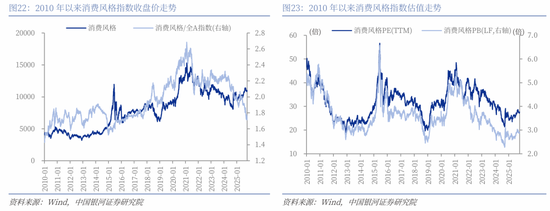 扩大内需这一趋势在A股市场形成明确投资指引,兼具政策红利支撑与业绩韧性的消费龙头及高成长细分赛道,将逐步凸显配置价值。截至2025年10月27日,消费风格PE(TTM)为27.59倍,处于2010年以来32.17%分位数水平;PB(LF)为2.88倍,处于2010年以来12.53%分位数水平,未来上升空间较大。