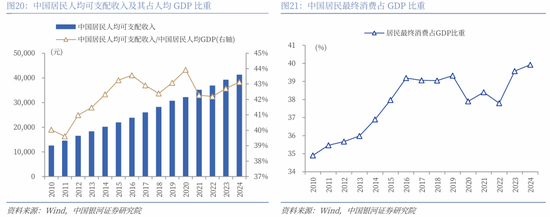 长期来看,消费取决于收入水平。2010年以来,随着我国经济结构的持续优化与收入分配机制的逐步改善,居民人均可支配收入占人均GDP比重呈现出波动上升的积极趋势,从2010年的40.04%上升至2024年的43.13%。同期我国居民最终消费占GDP比重总体也呈震荡上升趋势。