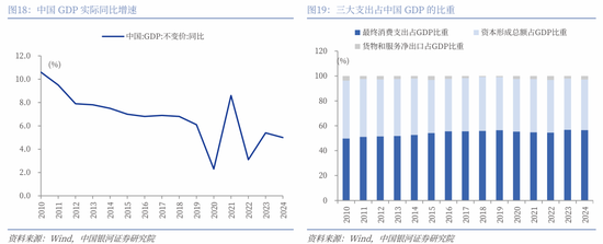 2024年,中国GDP实际同比增速为5%,有效需求不足仍是制约国内经济发展的主要矛盾。内需方面,2010年以来,投资占GDP比重呈下降趋势,而消费占GDP比重呈上升趋势。按支出法统计,2010年最终消费支出占GDP比重为49.87%,2024年上升6.68个百分点至56.55%。其中,居民最终消费支出占GDP比重由2010年的34.91%上升至2024年的39.92%,涨幅为5.02个百分点。