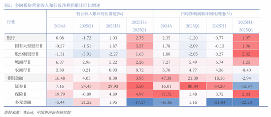 业绩层面,2025年上半年,银行营收同比增速由负转正,为1.03%,非银金融同比增速由一季度的4.05%,提升到上半年的8%。从归母净利润同比来看,2025年上半年,银行实现同比增长0.77%,非银金融维持高景气,实现18.36%的同比增速。从细分板块来看,银行行业中,存款挂牌利率下调,缓解银行负债端成本压力,国有大型银行归母净利润同比降幅收窄,股份制银行同比增速由负转正,城商行同比增速较一季度进一步提高,而农商行同比增速有所放缓。非银金融行业中,上年低基数影响叠加市场成交活跃,证券板块归母净利润同比高增64.2%。保险板块归母净利润同比由一季度的1.4%,提升到上半年的3.72%,维持增长态势。